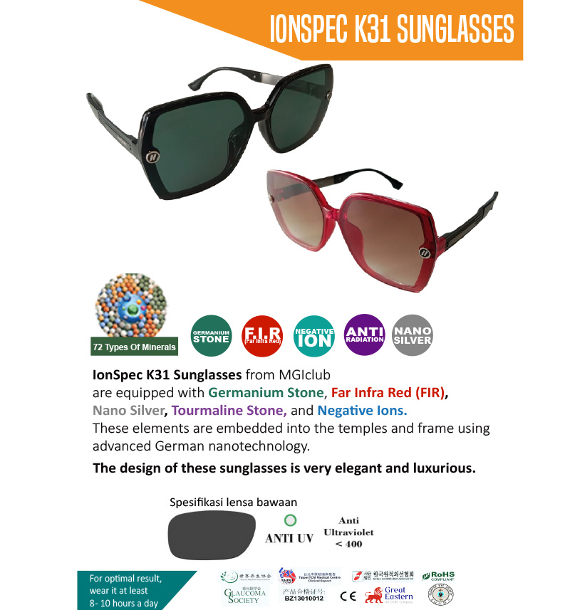 IONSPEC K31 Sunglasses is a premium eyewear product from MGIClub Global, combining modern design with advanced German nano-technology. This product features a unique innovation through the integration of specialized minerals within the frame and temples, delivering added value beyond aesthetics.
