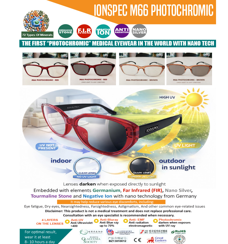The IonSpec M66 Photochromic Series by MGIClub Global is designed with photochromic lens coating technology, which allows the lenses to automatically adjust their tint level when exposed to sunlight. This feature helps enhance visual comfort by reducing glare during outdoor activities.