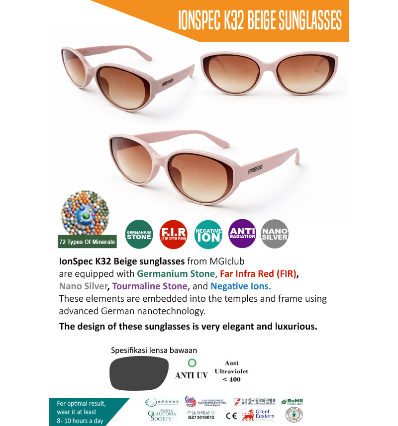 IonSpec K32 Beige medical sunglasses from MGIclub are equipped with a Germanium stone attribute, Far Infrared (FIR), Nano Silver, tourmaline stone, and also Negative Ion embedded in its temples and frames through nanotechnology from Germany making it the only sunglasses with medical functions in the world. The model is elegant and dynamic, very suitable for anyone who wants to look fashionable and contemporary