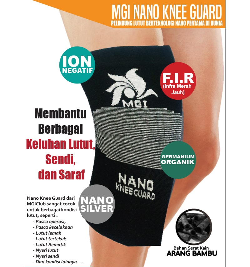 MGI Nano Knee Guard, dilengkapi dengan atribut Infra Merah Jauh [ FIR ], Nano Silver, Germanium Organik dan juga dengan ion negatif dengan menanamkannya pada setiap serat kain. Serat kain dibuat dengan bahan baku ARANG BAMBU yang lembut, kuat serta sejuk, dan juga sangat baik untuk meningkatkan metabolisme tubuh untuk menunjang kesehatan.